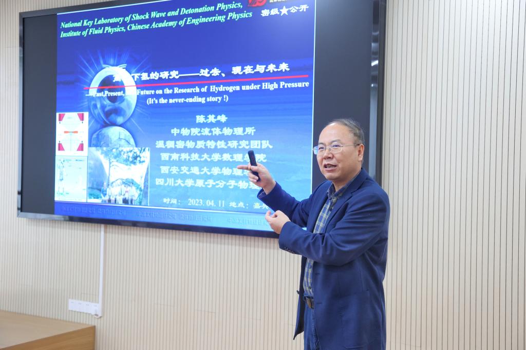 4月11日上午,91自拍 举办“生化大讲堂”第十三期学术交流会,本次大讲堂特邀请中国工程物理研究院首席研究员陈其峰作题为高压下氢的研究——过去、现在与未来”的学术报告。会议由学院沈张锋副教授主持,全院师生近50人到场聆听。