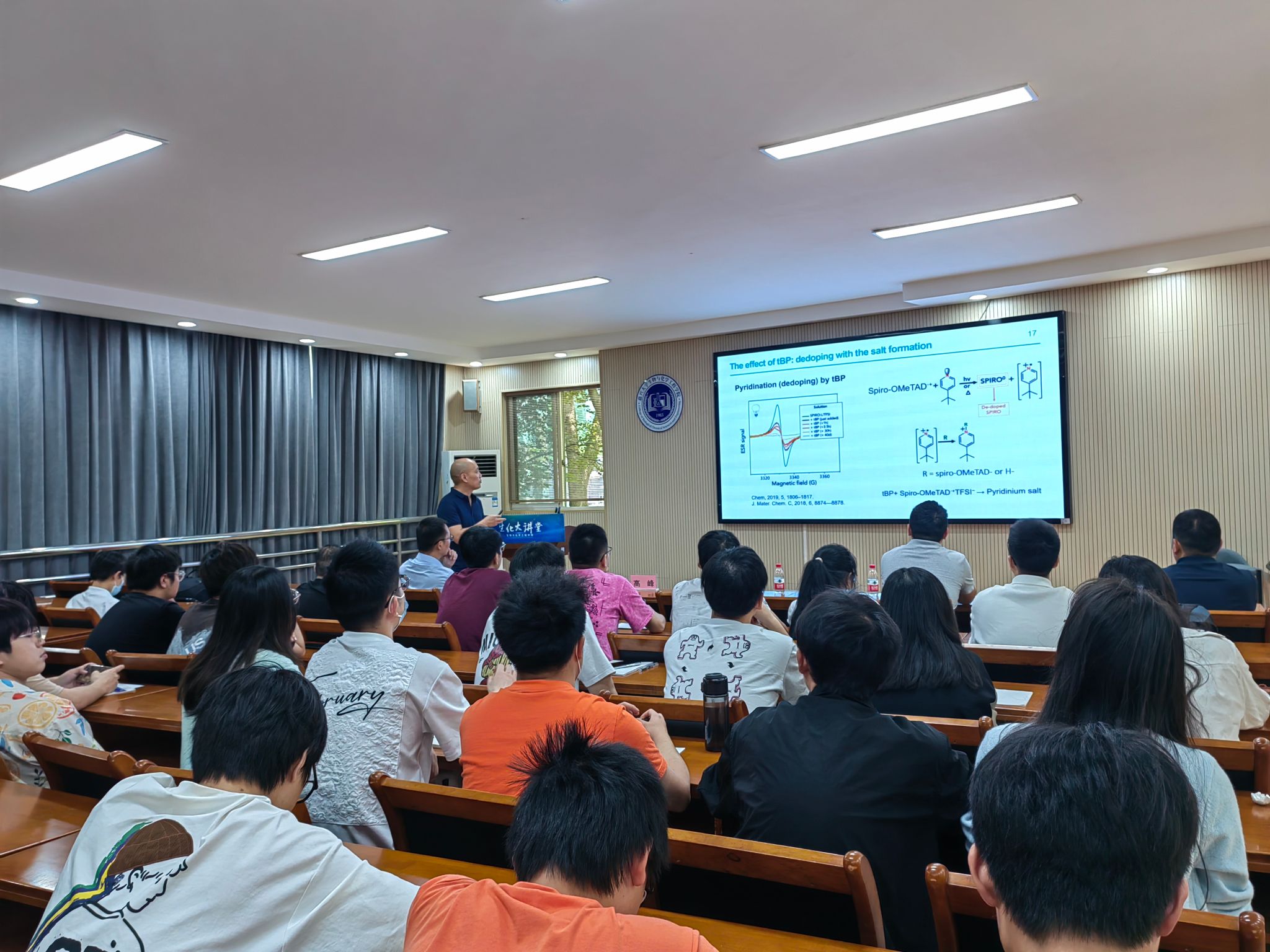 金属卤化物钙钛矿在新一代光电器件,包括太阳能电池和发光二极管(LED)中显示出巨大的应用前景。对于钙钛矿太阳能电池(PSCs),高峰教授课题组通过开发一种新的spiro-OMeTAD空穴传输层掺杂策略以提高器件运行的稳定性;同时引入离子盐来进一步调节功函数,而且这种引入对薄膜电导率的影响也几乎是可以忽略不计的,这对于通过有利的能级排列达到最佳开路电压值至关重要,为实现高效率和优异稳定性的PSC铺平了道路。对于钙钛矿LED,与其他LED中使用的发光材料相比,其具备可以有效地探测光这一独特特性,这使得钙钛矿LED能够实现一些其他LED技术几乎不可能实现的新应用成为可能;通过利用钙钛矿LED这一优势,高峰教授课题组最近开发了使用高光响应钙钛矿LED作为像素的多功能显示器,这种LED显示屏可以同时用作触摸屏、指纹传感器、环境光传感器和图像传感器,而无需集成任何额外的传感器,显示出巨大的优势和应用前景。在报告结束后的互动交流环节,与会师生踊跃提问,高峰教授耐心地解答了师生们提出的问题,并就相关问题进行了深入的交流讨论,现场气氛热烈。