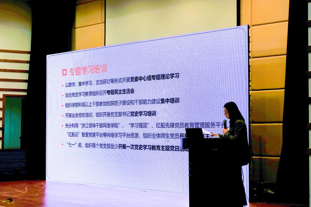 随后,杨丽娜对学院全体师生党员进行党史学习教育动员,并为大家上了一堂题为《奋斗百年路 启航新征程》的主题党课。她从“为什么学党史”、“党史学什么”、“党史怎么学”三个层面进行详细说明,为大家解疑答惑,进一步提高了全体党员的思想认识和党性修养。她要求全体师生党员牢记习近平总书记提出的“学党史、悟思想、办实事、开新局”“学史明理、学史增信、学史崇德、学史力行”目标要求,积极参与各种庆祝活动,展现红船学子蓬勃精神风貌,认真开展党史学习教育,筑牢理想信念之基,努力做到知行合一,全力支持91自拍 创建,以优异成绩向建党百年献礼。