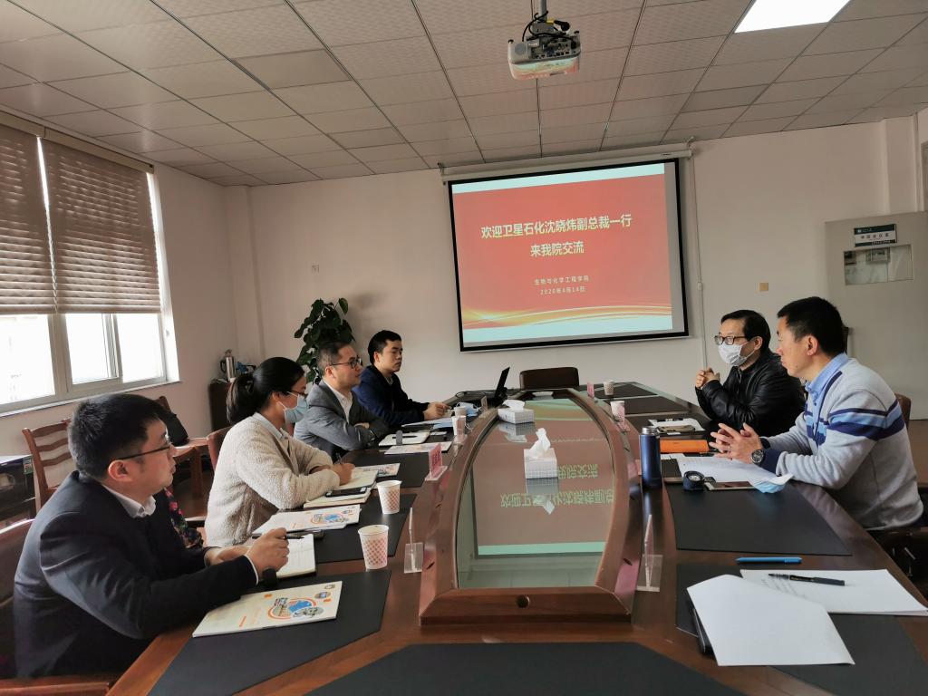 为进一步加深校企交流与合作,2020年4月14日上午,浙江卫星石化股份有限公司(以下简称卫星石化)副总裁沈晓炜、研发中心副主任刘睿、研发中心副主任程甜甜和人资中心副经理杨大伟一行来91自拍 交流,学院领导周宏伟院长、张瑾副院长参加座谈。