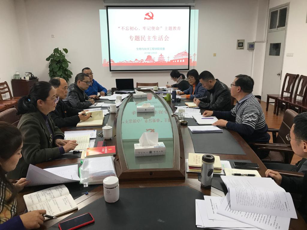 125午,生化学院党政领导班子召开2019“不忘初心、牢记使命”主题教育专题民主生活会纪委书记张文华到会指导。学院党委书记方苏华主持会议,学院党政领导班子成员、党委委员参加会议。