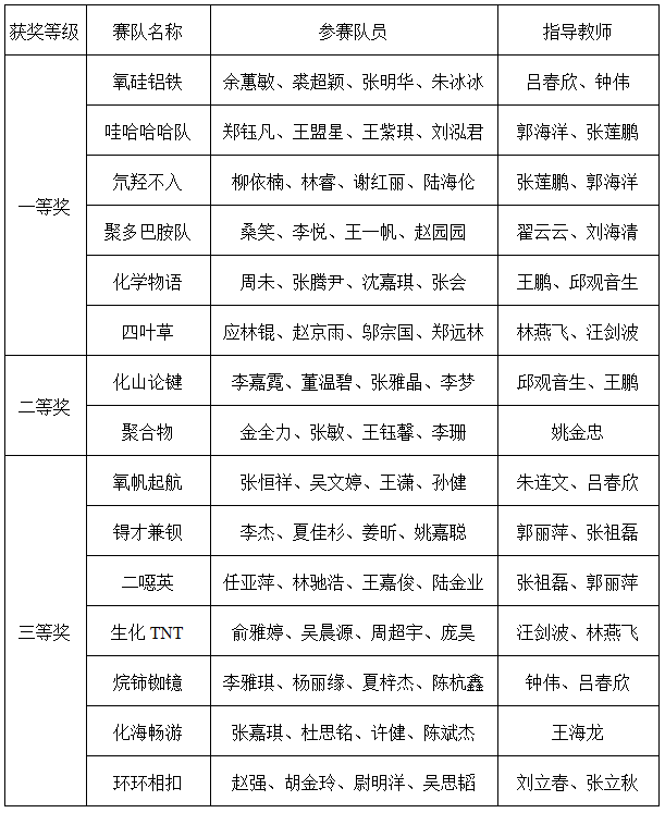 嘉兴学院参加第十一届浙江省大学生化学竞赛获奖名单