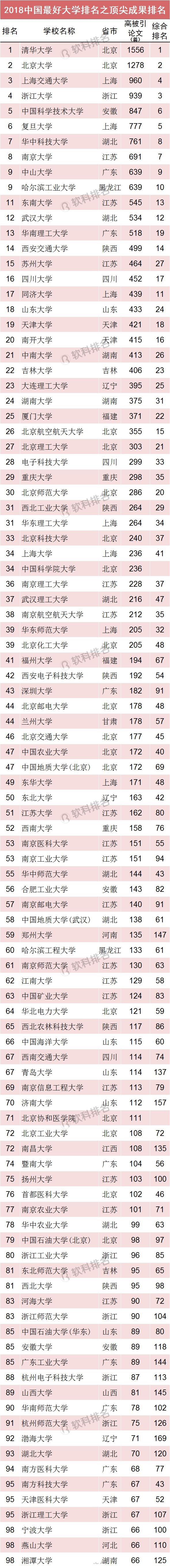 2018中国最好大学排名——顶尖成果排名
