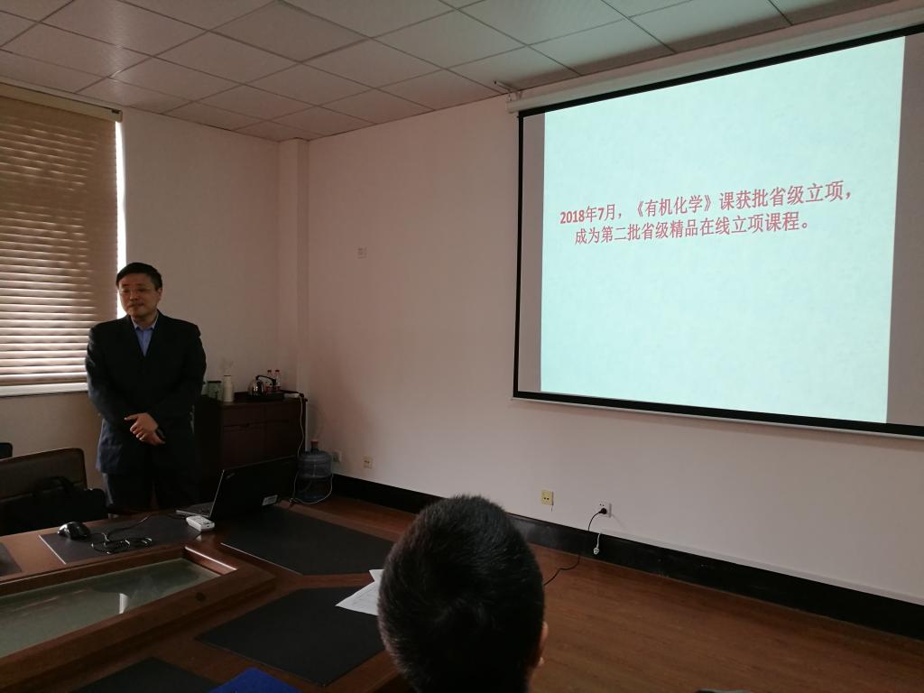 91自拍 有机化学课程组组长杨义文老师以《有机化学》课程为例,主要从申报书的撰写、慕课的拍摄、网站的维护与使用等方面交流了自己在精品在线开放课程申报与建设方面的经验。随后91自拍 的优秀青年教师代表邱观音生老师以自己的亲身经历做了一个题为“青年教师如何处理好教学和科研的关系”的简短发言。
