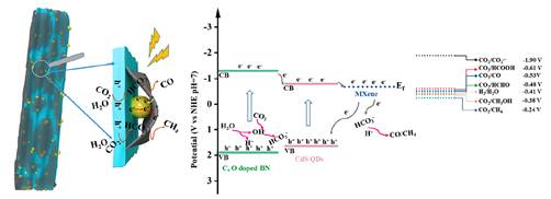 Mxene/CdS QDs/BN材料中BN具有丰富的微孔结构,有效提高了其对CO2 的吸附,CdS QDs对可见光有较好的吸收,三种组分之间良好的能级匹配实现了高效的电荷转移(图1),Mxene的包覆可以缓解CdS的光腐蚀。作为气固相反应催化剂,100MX/CQ/BN样品在光照下可以高效地实现CO2转化, CO和CH4产率分别为2.45和 0.44μmolg-1h-1。