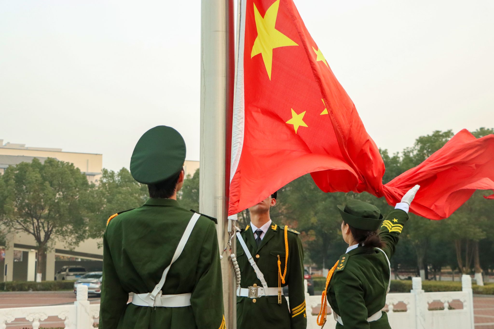 四名升旗手目光如炬,身姿挺拔。他们肩扛红旗,步伐铿锵有力,主升旗手迎风振臂,将国旗高高扬起五星红旗如火焰般绽放,在晨光中舒展、上升,与朝阳同辉。全体师生肃立注目,歌声嘹亮,目光坚定。